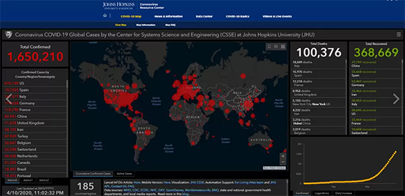 করোনাভাইরাসে (কোভিড ১৯) বিশ্বজুড়ে প্রাণহানির সংখ্যা এক লাখ অতিক্রম করেছে এবং শনাক্ত রোগীর সংখ্যা ছাড়িয়েছে সাড়ে ১৬ লাখ। যুক্তরাষ্ট্রের জনস হপকিনস ইউনিভার্সিটির রাত সাড়ে ১১টার দিকে হালনাগাদ তথ্যে এ কথা জানিয়েছে।