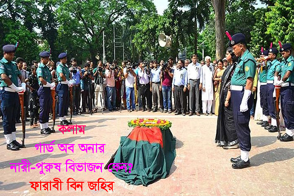 অবিশ্বাস্য হলেই সত্যি যে, নারীর ক্ষমতায়নে বাংলাদেশ যখন নিজেকে রোল মডেল হিসেবে দাবি করছে ঠিক সেই সময়ে বীর মুক্তিযোদ্ধাদের ‘গার্ড অব অনার’ দেওয়ার ক্ষেত্রে নারী কর্মকর্তাদের বাদ রাখতে বলেছে সংসদীয় একটি কমিটি। তাদের প্রস্তাবের পেছনে যুক্তিটিও বড়ো অদ্ভুত! নারীরা জানাজাতে থাকতে পারে না সেক্ষেত্রে তারা কীভাবে গার্ড অব অনার দেন-জাতীয় অসাড় এবং হাস্যকর আপত্তিকে মাথায় নিয়ে তারা এ প্রস্তাব দেন। অথচ এ প্রস্তাব দেওয়ার সময় সেসব মহোদয়দের মাথায় একবারের জন্য কাজ করেনি যে, জানাজা একটি ধর্মীয় বিধান এবং গার্ড অব অনার একটি রাষ্ট্রীয় বিধান। দুইটি সম্পূর্ণ ভিন্ন বিষয়। একটির বিধি-বিধানের সাথে অপরটির বিধি-বিধানের কোনো সম্পর্ক নেই। অথচ আমাদের সংসদীয় কমিটির বিজ্ঞজনেরা কোন যুক্তিতে নারী কর্মকর্তাদের বিষয়ে এমন বিমাতাসুলভ প্রস্তাব দিলেন তারাই বলতে পারবেন!