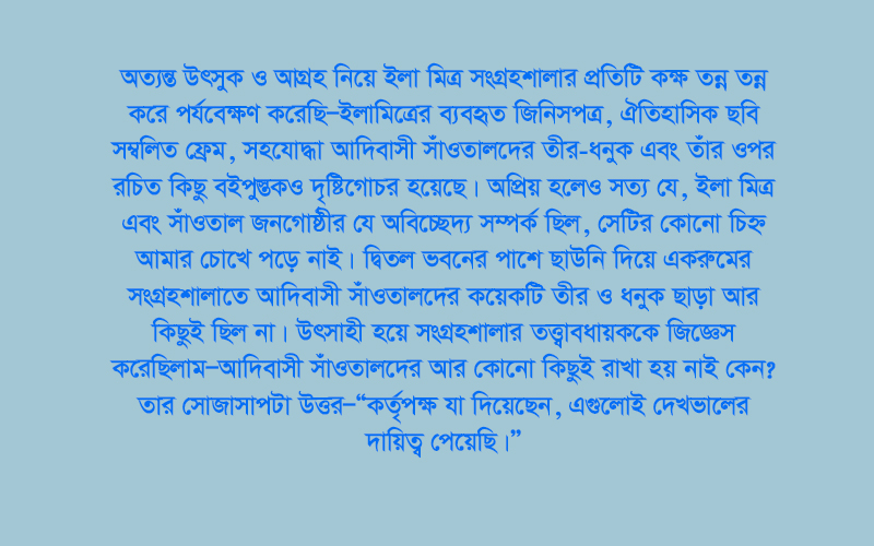 ইলা মিত্রের সংগ্রহশালাতে ইলা মিত্রের ঐতিহাসিক ছবিগুলো স্থান পেয়েছে, রয়েছে তাকে নিয়ে প্রকাশিত তৎকালীন পত্র-পত্রিকার গুরুত্বপূর্ণ সংবাদ। কোথাও কোনো জায়গাতে সাঁওতালদের নাম উচ্চারিত হয় নাই। প্রদর্শিত হয় নাই, পুরো সংগ্রহশালাতে একমাত্র তীর-ধনুক ছাড়া কোথাও আর সাঁওতালসহ আদিবাসীদের অধিকার লড়ায়ে ব্যবহৃত জিনিসপত্র! কি দুর্ভাগ্য আমাদের অধিকার আদায়ের ইতিহাস, সত্যকে অস্বীকার করে জাতি কৃতার্থ হতে পারে না। যুগ-যুগান্তে ন্যায্যতার আন্দোলন, বিদ্রোহসমূহ নতুন প্রজন্মদের জ্ঞানের শিখাকে প্রজ্জ্বলিত করে। সংশ্লিষ্ট মন্ত্রণালয় ও জেলা প্রশাসনের কাছে সবিনয় অনুরোধ, অতি সত্ত্বর ইলা মিত্র সংগ্রহশালাতে বিদ্রোহে সাঁওতালসহ আদিবাসীদের ব্যবহৃত জিনিসপত্র এবং স্মৃতিফলক সংস্কার করে সঠিক ও তথ্যপূর্ণ ইতিহাস উপস্থাপন করুন।
