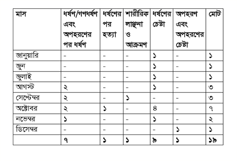 ১৯ অক্টোবর, ২০২০ খ্রিষ্টাব্দে এক প্রতিবেদনে দেখা যায়, বিগত এক মাসে অর্থাৎ সেপ্টেম্বর মাসে পার্বত্য চট্টগ্রামে ধর্ষণের শিকার হন আটজন আদিবাসী নারী। বাংলাদেশের মানবাধিকার সংস্থা ‘আইন ও সালিশ কেন্দ্র’র মতে ২০২০ খ্রিষ্টাব্দের প্রথম নয় মাসে ৯৭৫ জন নারী ও মেয়ে ধর্ষিত হয়েছিলো এবং ২৩৫ জন মহিলাকে তাদের স্বামী বা তার পরিবার হত্যা করেছে।