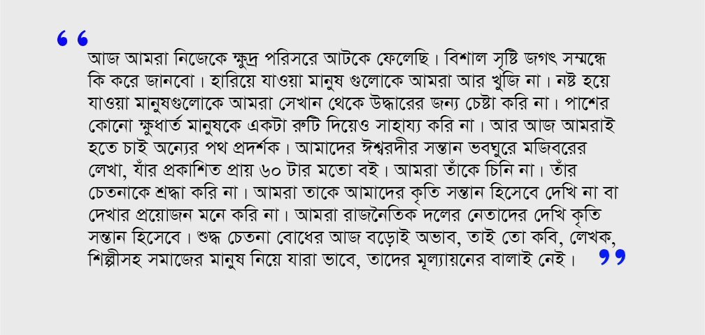 আজ আমরা নিজেকে ক্ষুদ্র পরিসরে আটকে ফেলেছি। বিশাল সৃষ্টি জগৎ সম্মন্ধে কি করে জানবো। হারিয়ে যাওয়া মানুষ গুলোকে আমরা আর খুজি না। নষ্ট হয়ে যাওয়া মানুষ গুলোকে আমরা সেখান থেকে উদ্ধারের জন্য চেষ্টা করি না। পাশের কোনো ক্ষুধার্ত মানুষকে একটা রুটি দিয়েও সাহায্য করি না। আর আজ আমরাই হতে চাই অন্যের পথ প্রদর্শক। আমাদের ঈশ্বরদীর সন্তান ভবঘুরে মজিবরের লেখা, যার প্রকাশিত প্রায় ৬০ টার মতো বই। আমরা তাকে চিনি না। তার চেতনাকে শ্রদ্ধা করি না। আমরা তাকে আমাদের কৃতি সন্তান হিসেবে দেখি না বা দেখার প্রয়োজন মনে করি না। আমরা রাজনৈতিক দলের নেতাদের দেখি কৃতি সন্তান হিসেবে। শুদ্ধ চেতনা বোধের আজ বড়োই অভাব, তাই তো কবি, লেখক, শিল্পী, সহ সমাজের মানুষ নিয়ে যারা ভাবে, তাদের মূল্যায়নের বালাই নেই।